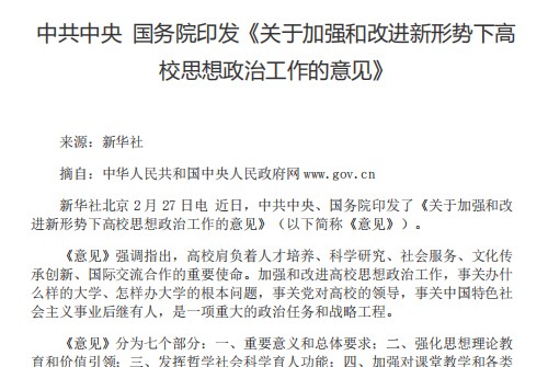 新华社北京 2 月 27 日电 近日,中共中央、国务院印发了《关于加强和改进新形势下高校思想政治工作的意见》(以下简称《意见》)。 -