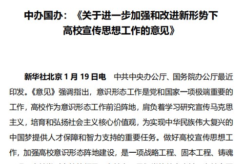 新华社北京 1 月 19 日电 中共中央办公厅、国务院办公厅最近 印发。《意见》强调指出,意识形态工作是党和国家一项极端重要的工作, -
